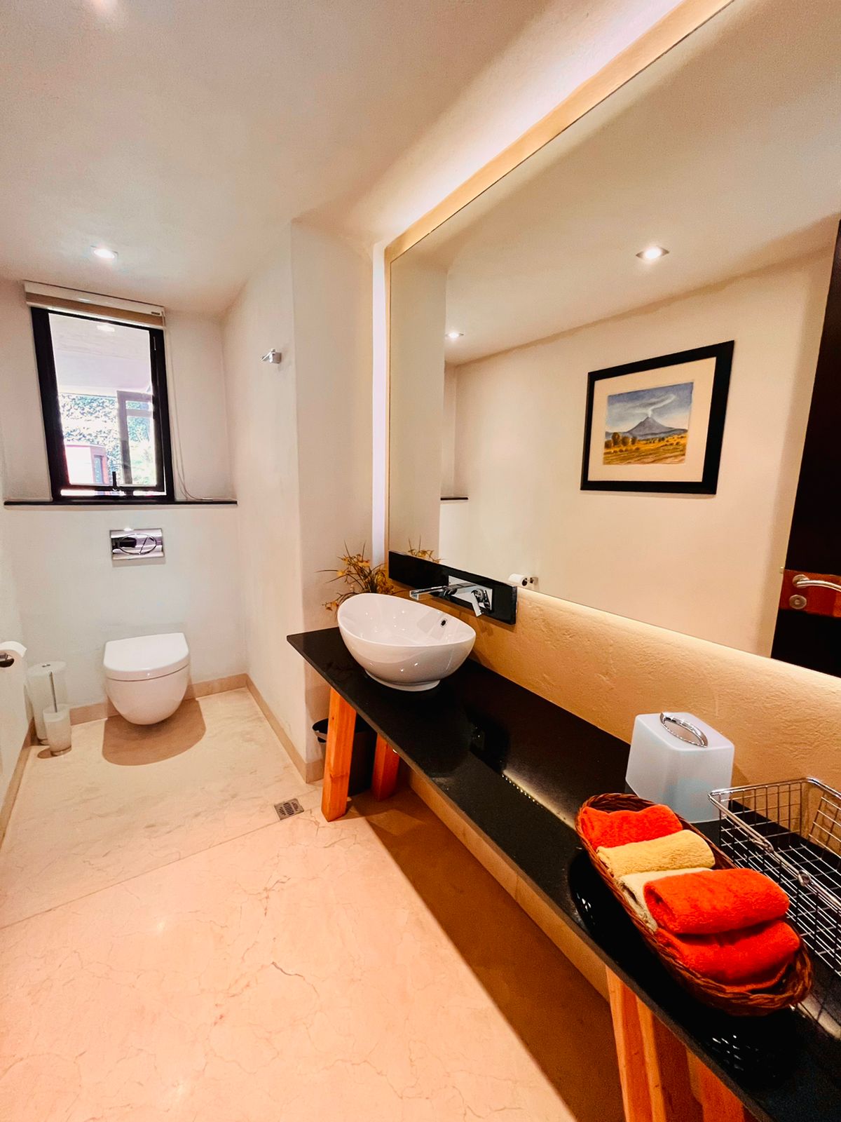 Al entrar, le recibe un pasillo distribuidor, que le lleva a la estancia que se ilumina con un enorme ventanal doble altura que le dejan disfrutar de una espectacular vista verde y hacia la cascada.