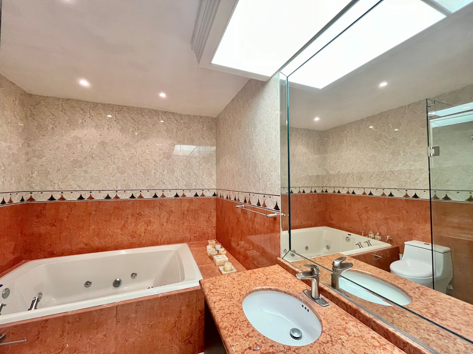 Al subir las escaleras, iluminadas por un gran domo, le recibirá un pasillo que conduce hacia la sala de televisión con un precioso balcón, la recámara principal de gran tamaño con balcón y una vista increíble, baño completo con tina y vestidor, dos recámaras secundarias ambas con baño completo y vestidor, y un clóset de blancos con escaleras hacia la azotea para mantenimiento.