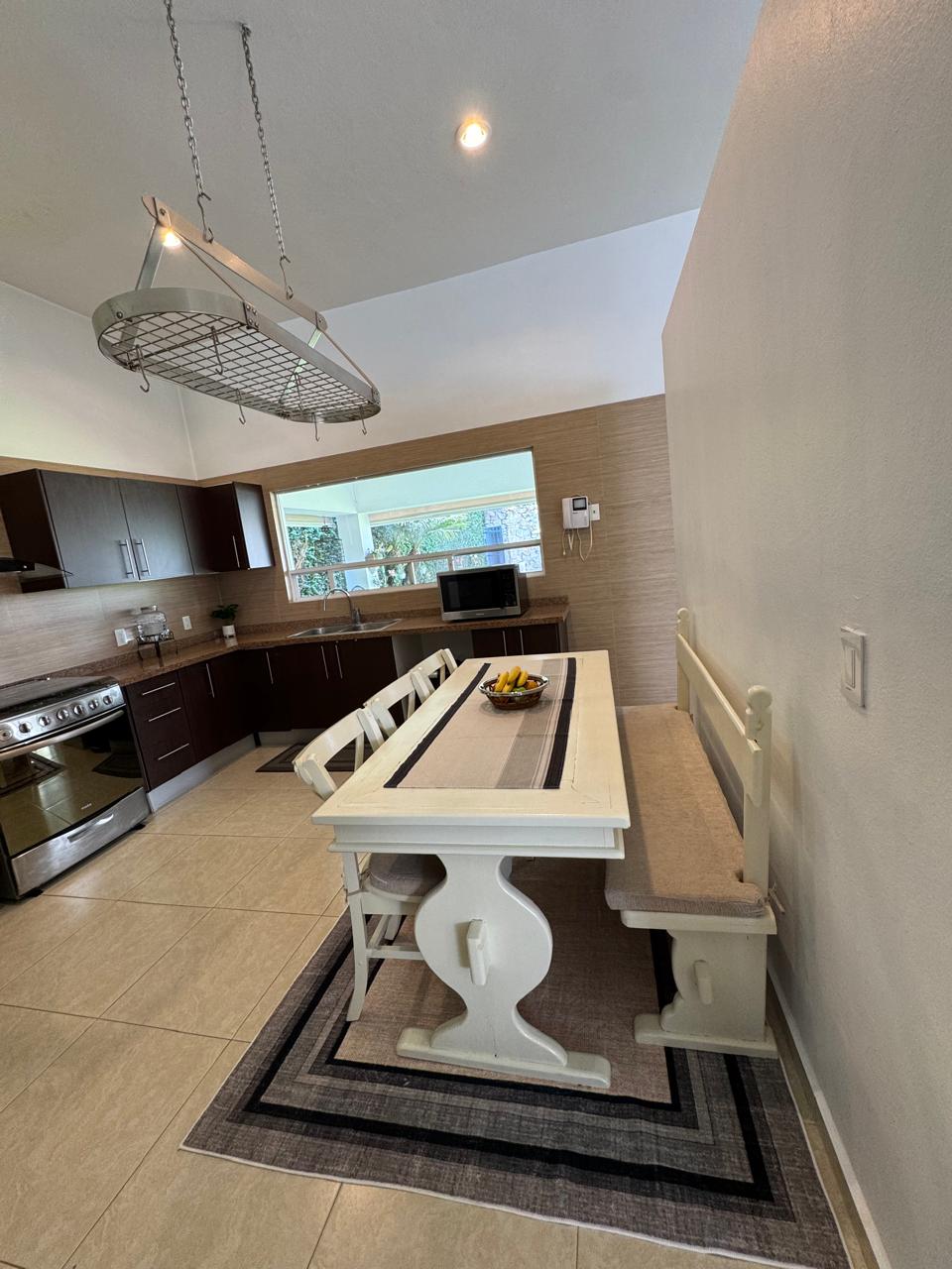 La sala y el comedor ofrecen vistas panorámicas al jardín, creando un ambiente elegante y acogedor. La cocina ha sido diseñada para brindar comodidad y funcionalidad, con amplio espacio de almacenamiento.