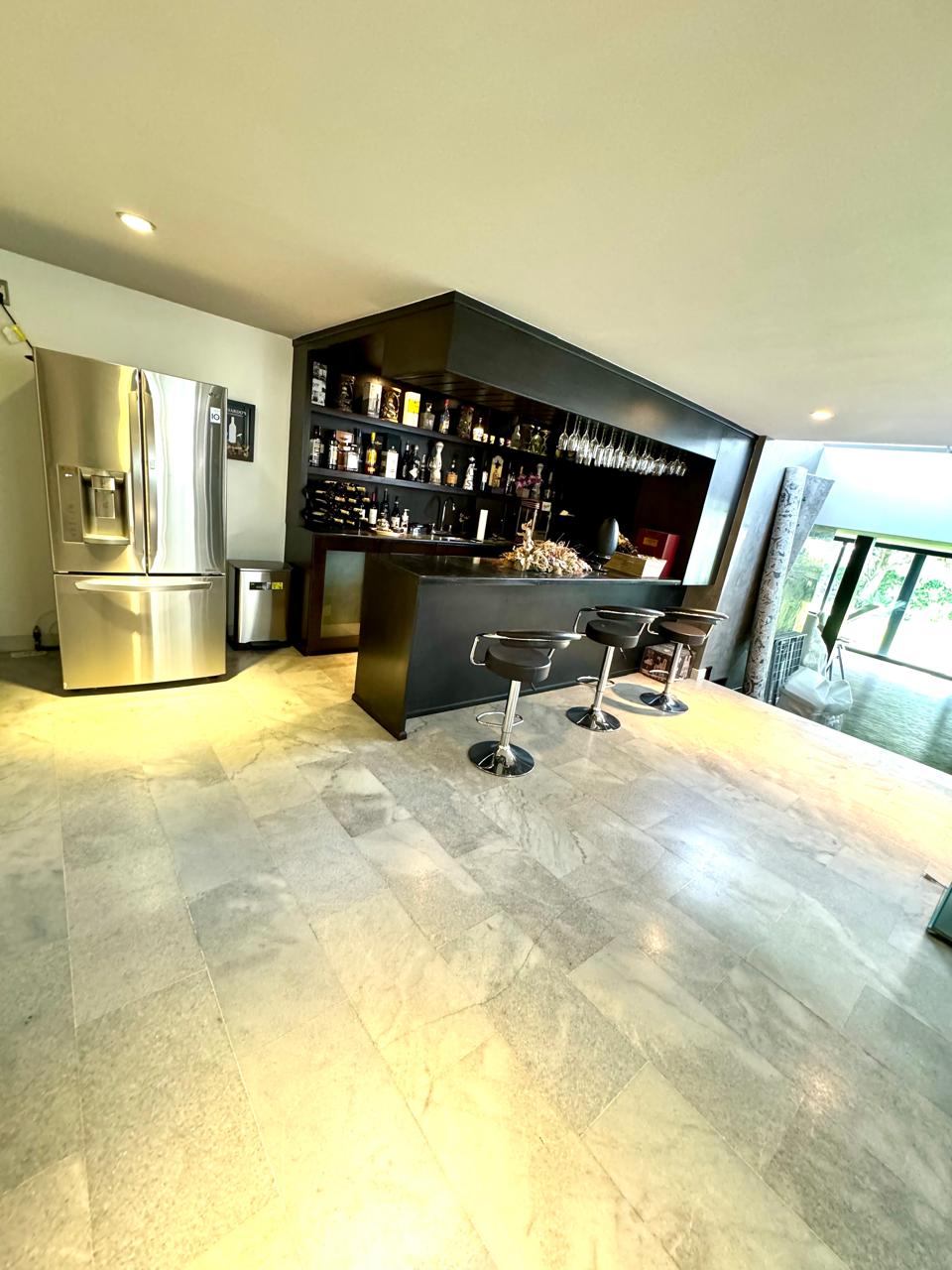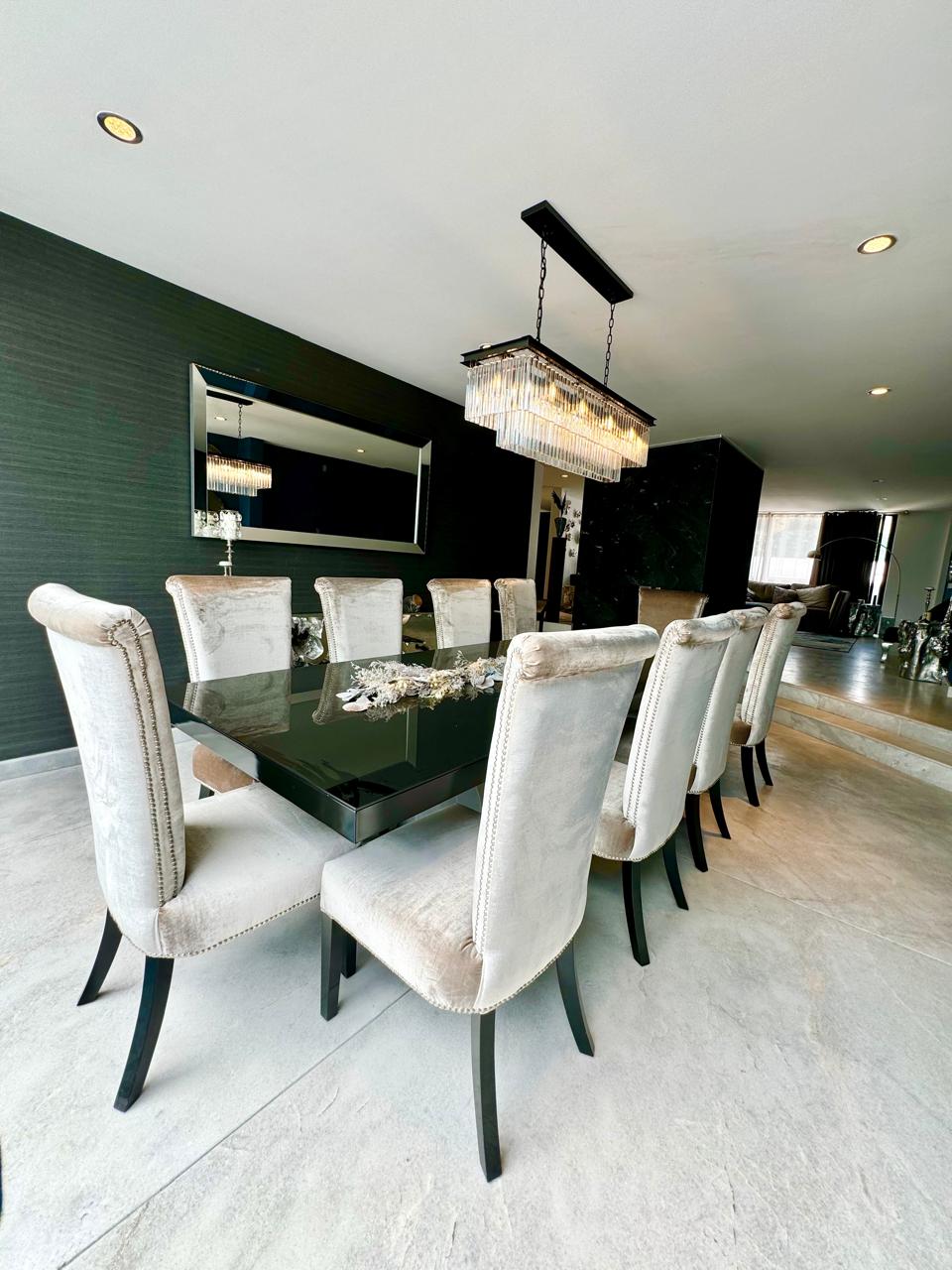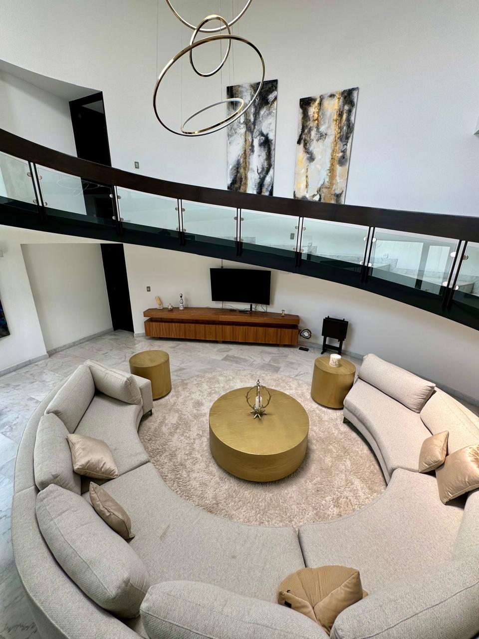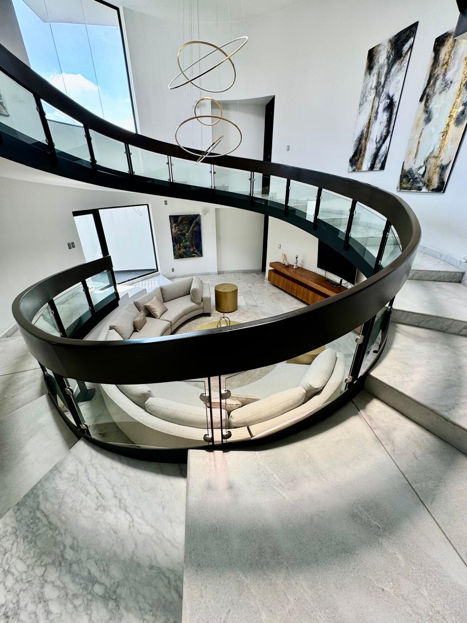 Impresionante sala redeada por las bellas y vistosas escaleras en caracol, cocina y antecomedor con acceso a una linda terraza, un gran salón de usos múltiples con bar y cava que se integran perfectamente al hermoso jardín.