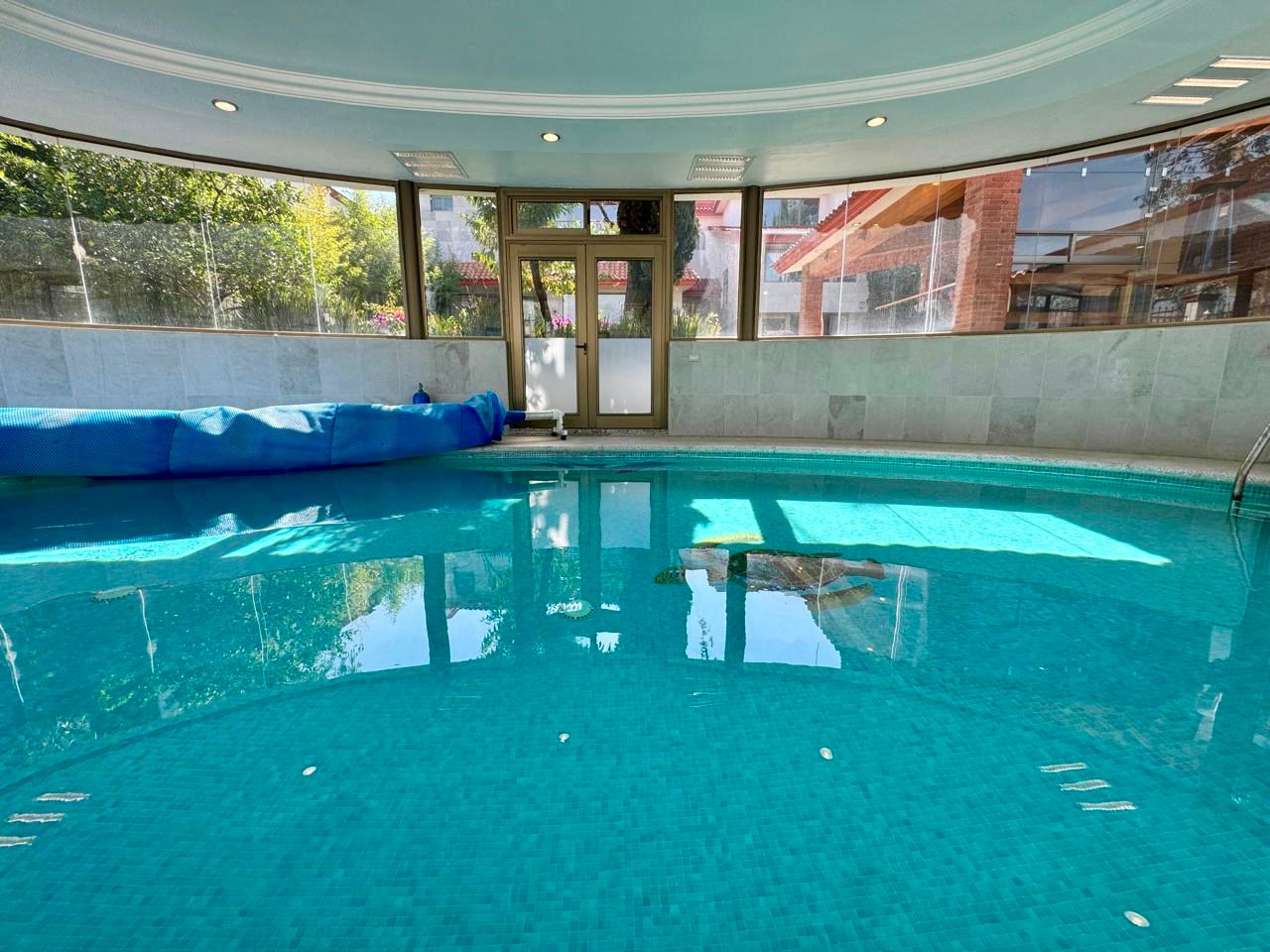 Grandiosa alberca techada con espacio para camastro y área de roof garden con sorprendentes vistas.
