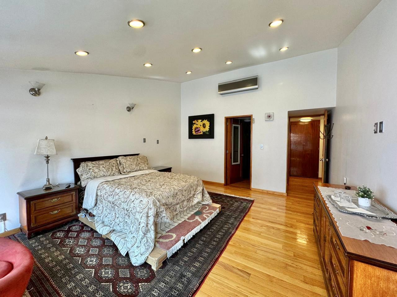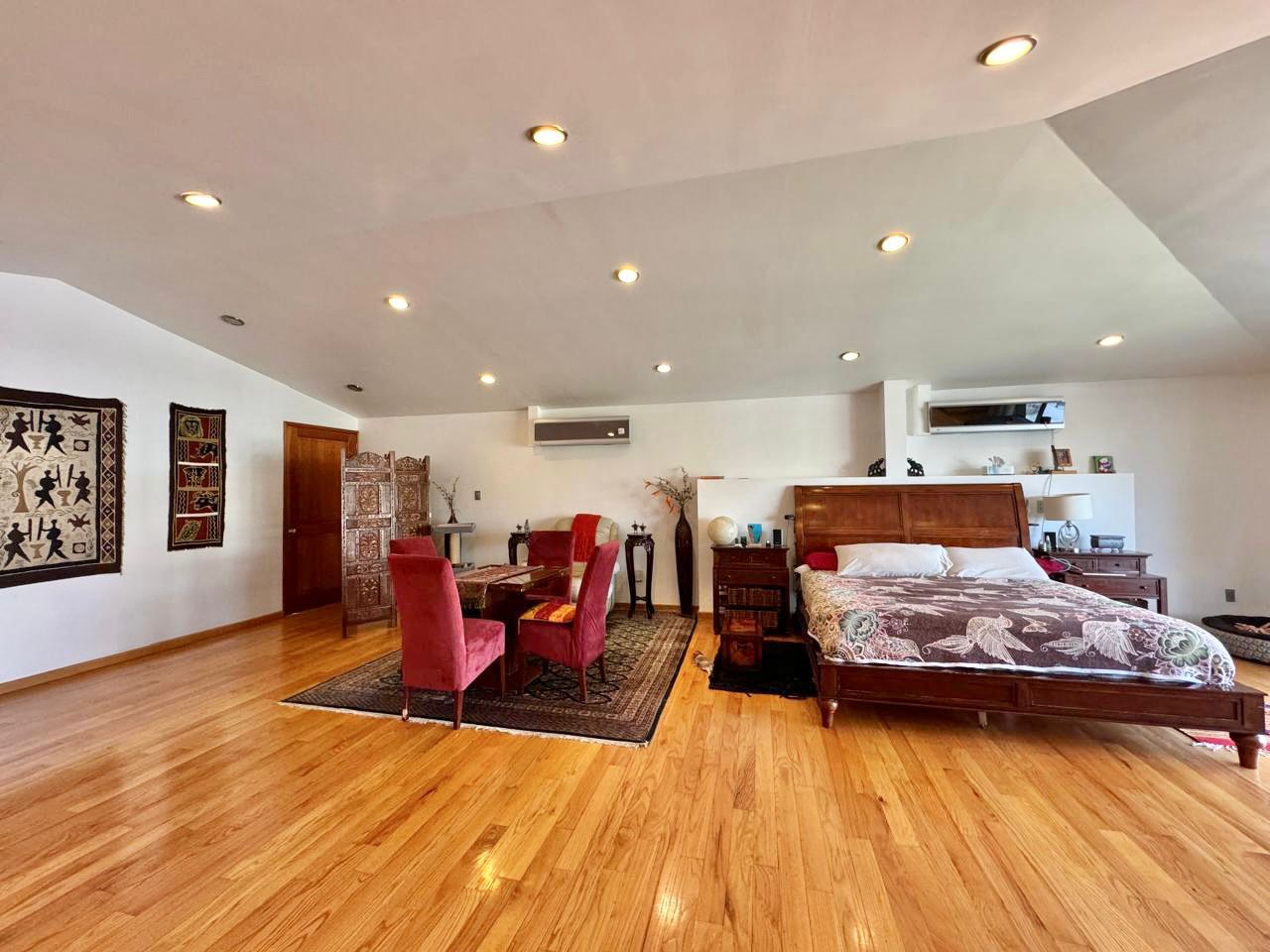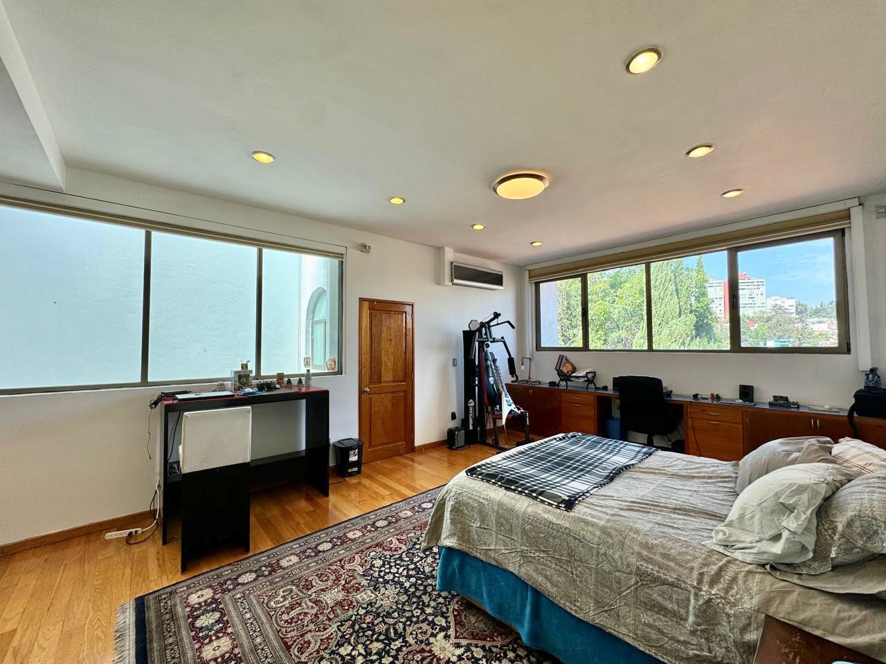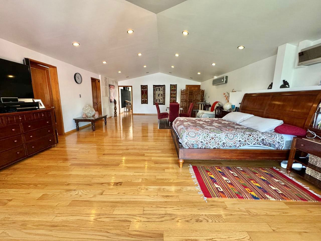 En la planta alta una estacia y 5 recámaras con baños completos, vestidores y aire acondicionado por minisplit, la principal con doble vestidor, balcón con vista al jardín y una oficina privada con balcón frontal.